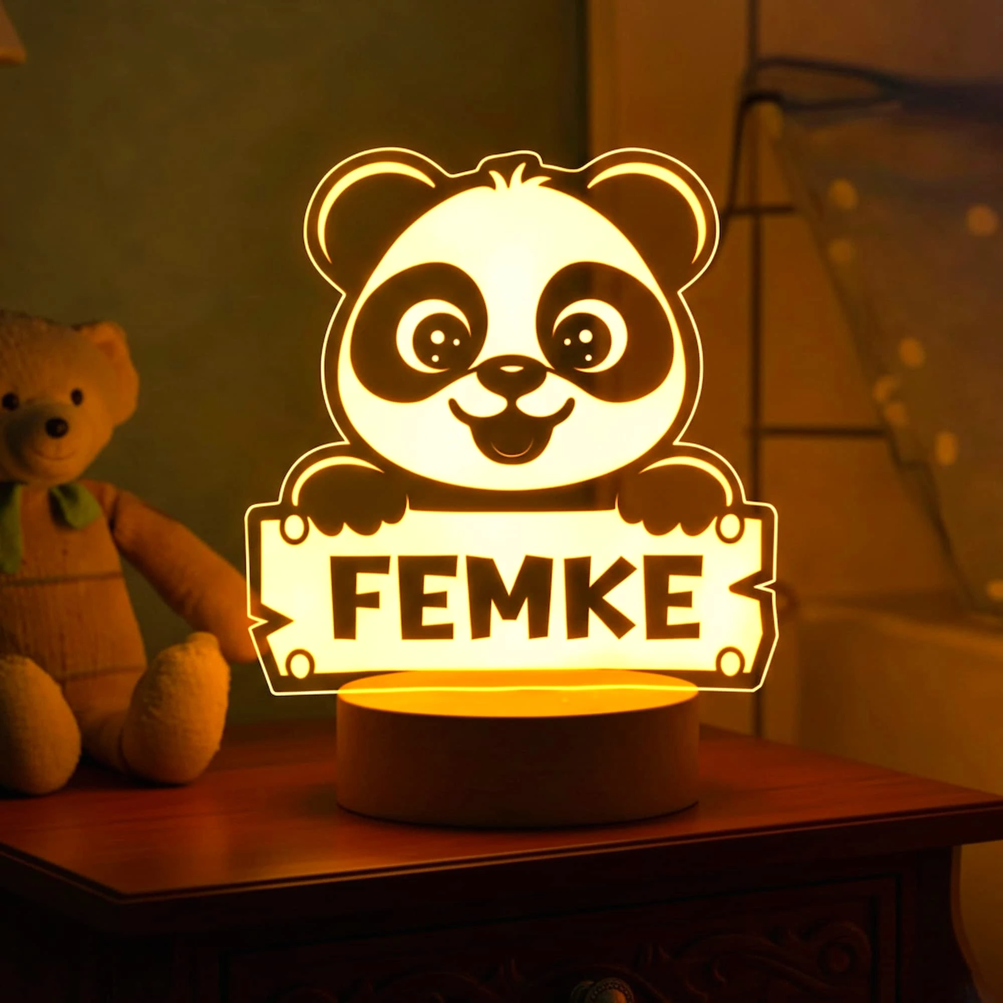 Gepersonaliseerd acryl LED lampje met een panda en naam naar keuze. Decoratie voor de kinderkamer en zeer geschikt als cadeau. Kinderkamer panda nachtlampje / sierlampje.